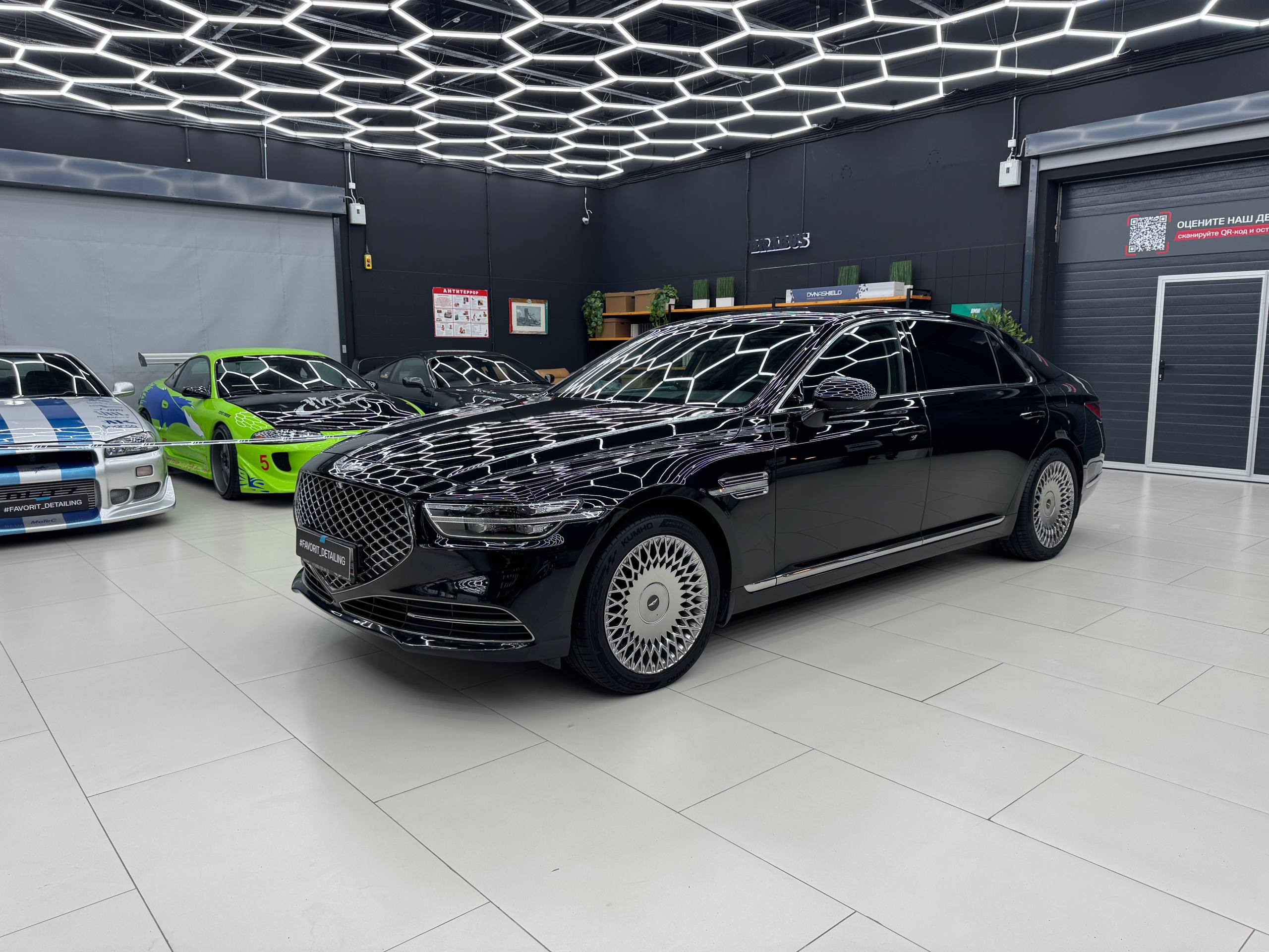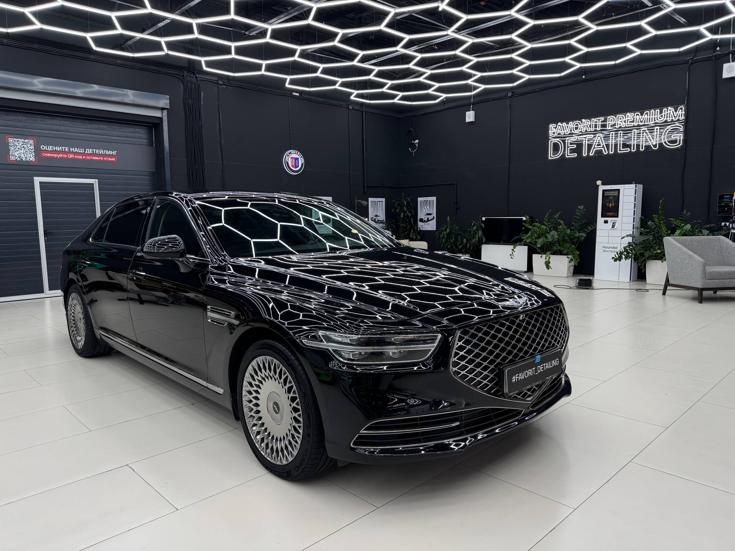 После комплекса работ Genesis G90 выглядит безупречно: кузов сияет ровным глянцем под слоем керамики, хром подчёркивает элегантность, а автомобиль полностью соответствует уровню представительского сегмента.