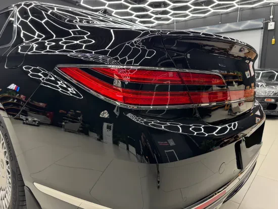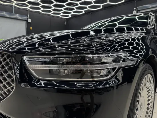 Выполнили восстановительную полировку, которая позволила устранить мелкие дефекты, выровнять отражения на крупных панелях и вернуть кузову Genesis G90 глубокий, насыщенный глянец.